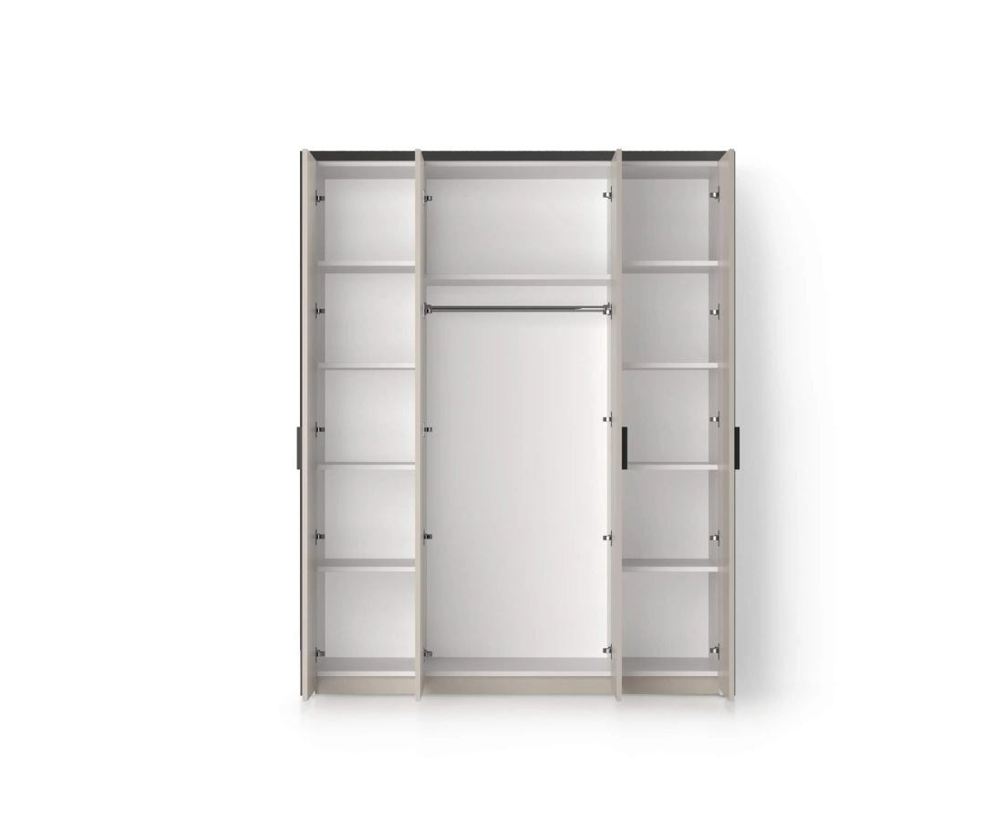 Просторный трехсекционный шкаф. Оснащён четырьмя фасадами с элегантными ручками. В центральной части находится штанга для плечиков. По бокам полочки для хранения одежды. Нежный цвет фасадов шкафа прекрасно контрастирует с рамой.