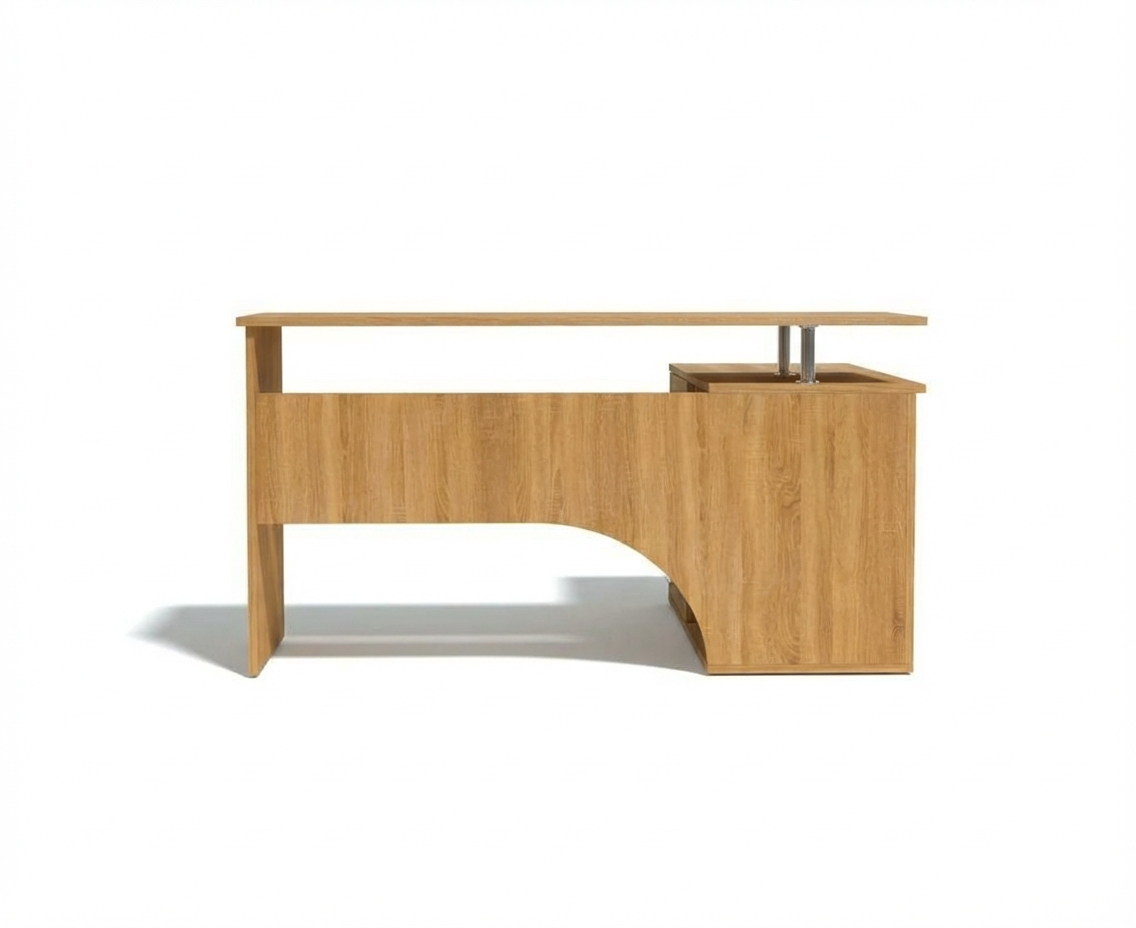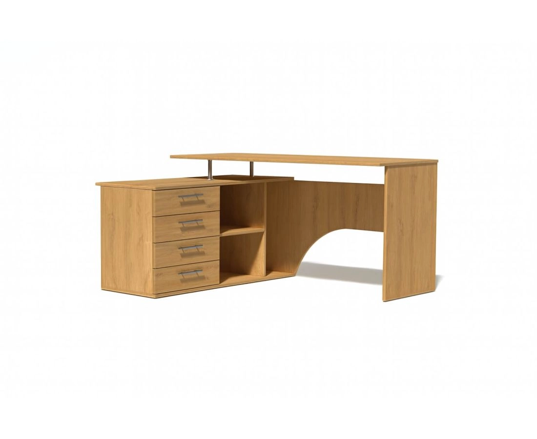 Угловой компьютерный стол с двумя рабочими поверхностями. Основная столешница имеет ширину 1400 мм, позволяя разместить компьютер и рабочие материалы. На малой столешнице – 1200 мм, удобно держать под рукой книги, папки, канцерярию, принтер.