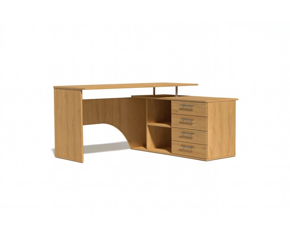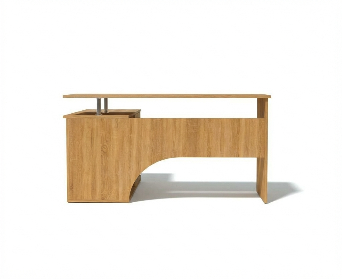 Угловой компьютерный стол с двумя рабочими поверхностями. Основная столешница имеет ширину 1400 мм, позволяя разместить компьютер и рабочие материалы. На малой столешнице – 1200 мм, удобно держать под рукой книги, папки, канцерярию, принтер.